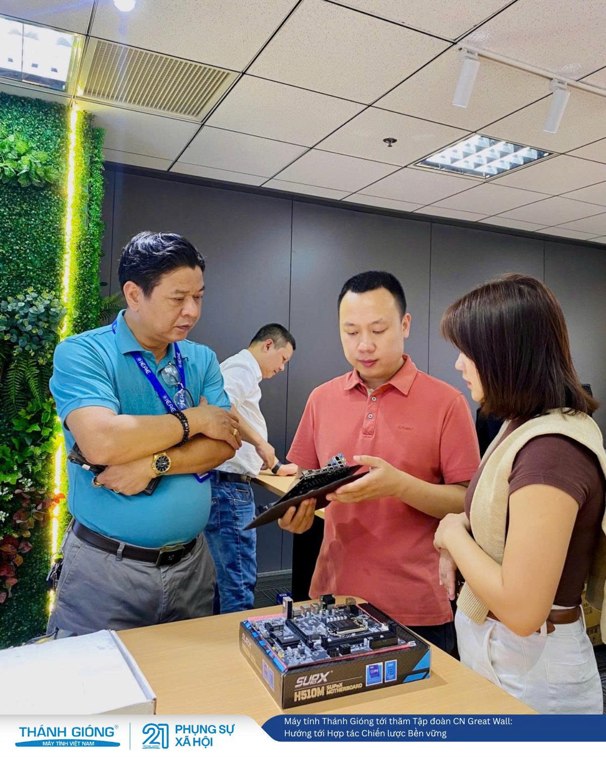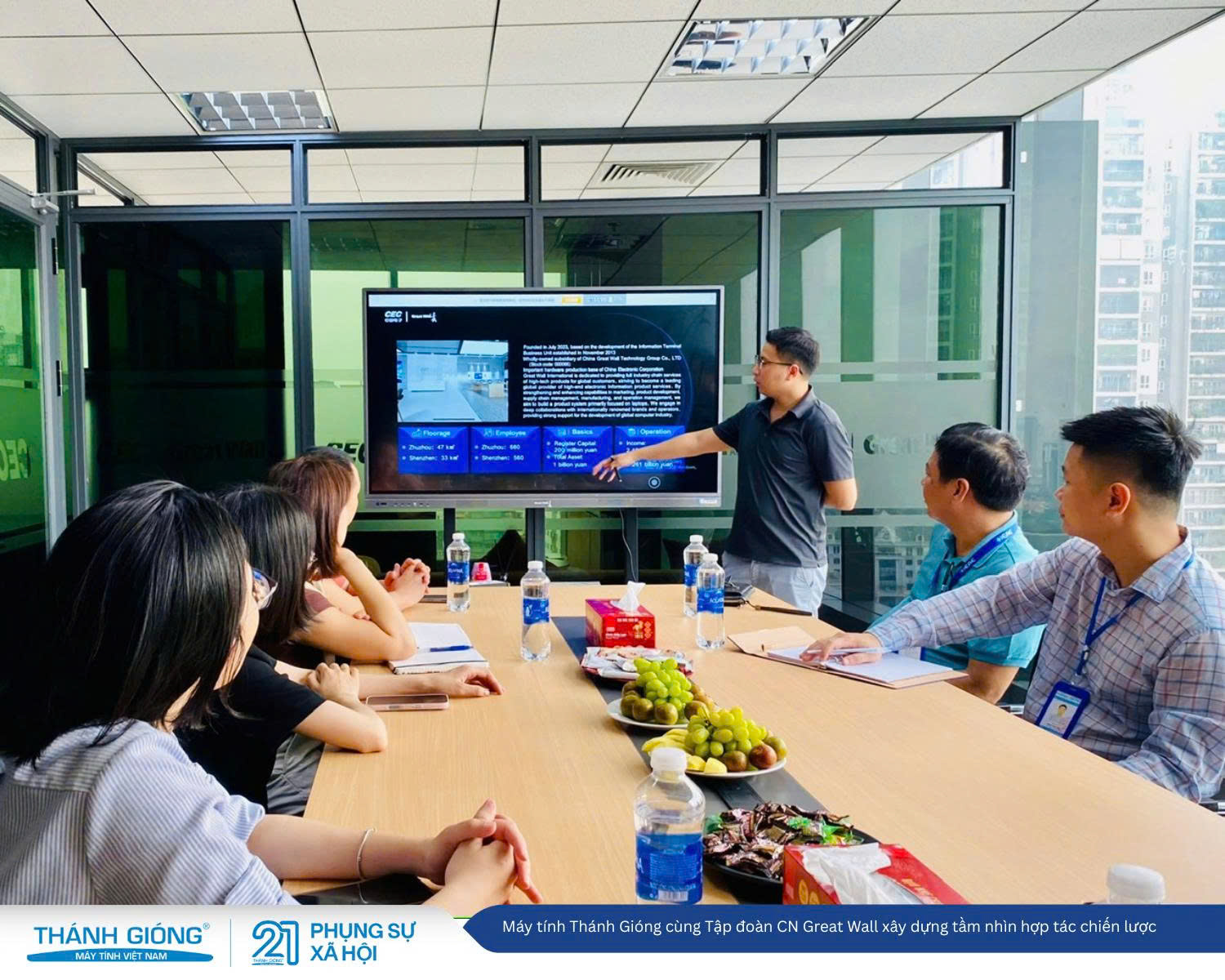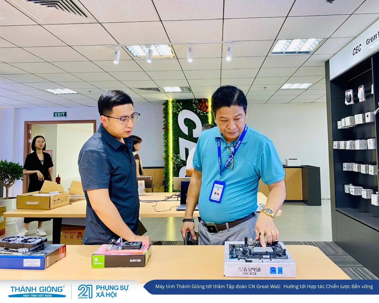 Trong không khí cởi mở và chuyên nghiệp, đại diện của China Great Wall đã trực tiếp giới thiệu về quy mô và các thành tựu công nghệ mới nhất của tập đoàn. Phái đoàn Máy tính Thánh Gióng đã dành thời gian tham quan khu trưng bày sản phẩm, trực tiếp trải nghiệm và đánh giá các linh kiện phần cứng, hệ thống máy chủ và các dòng máy tính thế hệ mới.